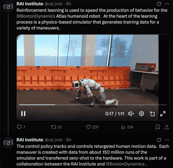为了进一步提升Atlas的学习效率,RAI Institute引入了物理引擎驱动的模拟器。该模拟器能够模拟出各种复杂的动作场景,生成海量的训练数据,使Atlas在虚拟环境中得以高效训练。据悉,每个动作的训练数据都来自于约1.5亿次的模拟器运行,这些在虚拟世界中锤炼的“技能”,能够直接应用于实体Atlas机器人上,无需额外的训练过程,极大地提高了训练效率。