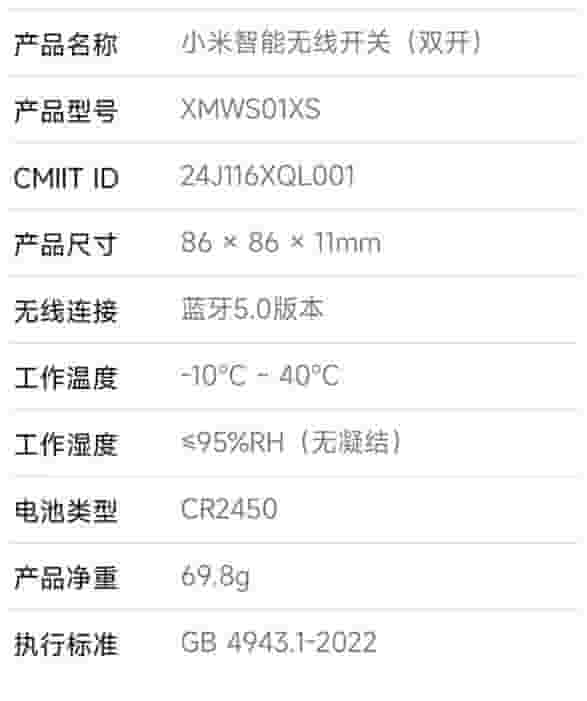 以下是小米智能无线开关(双开版)的详细参数图,供消费者参考:
