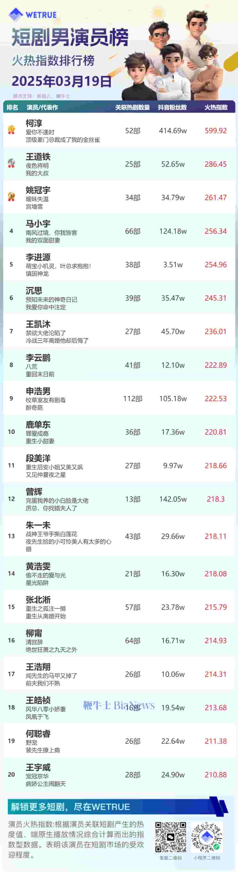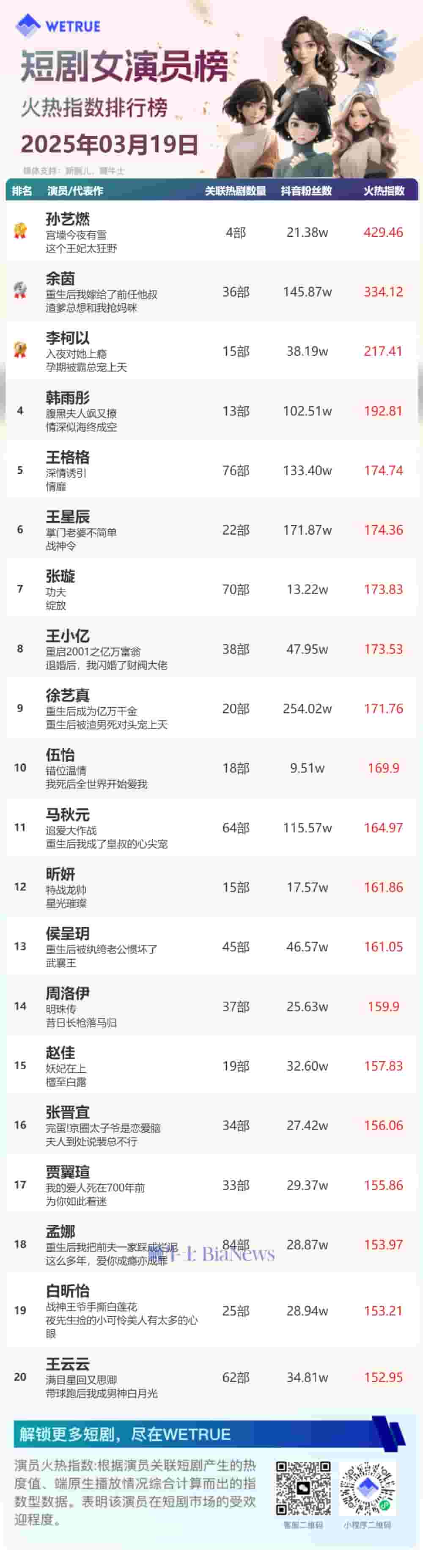 3月19日短剧演员热度榜揭晓:孙艺燃、柯淳登顶男女演员榜单