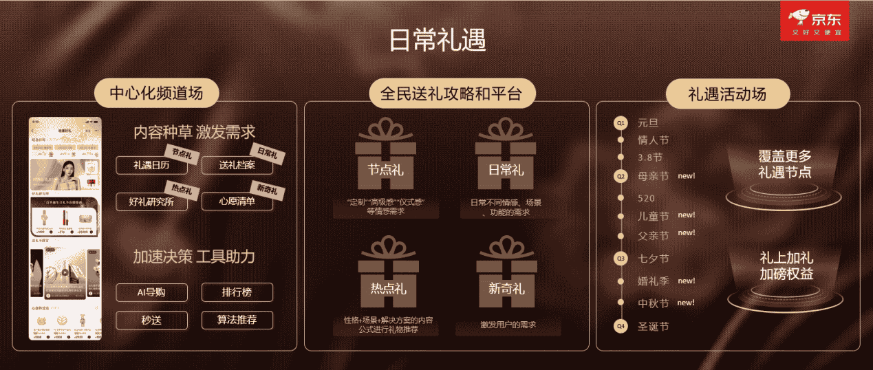 在营销方面,京东大时尚将构建“站内IP矩阵+全域内容营销”双轮驱动模式,通过全新升级的“京东新品”等IP,加快新品打爆速度,并基于多品类专属营销IP,实现全时段、全场景覆盖。同时,京东大时尚还将全面发力站内外联动,通过短视频、、达人种草等多种形式,强化时尚消费用户及品类心智,并推出日常礼遇新赛道,将礼赠常态化,增强消费者购买粘性。