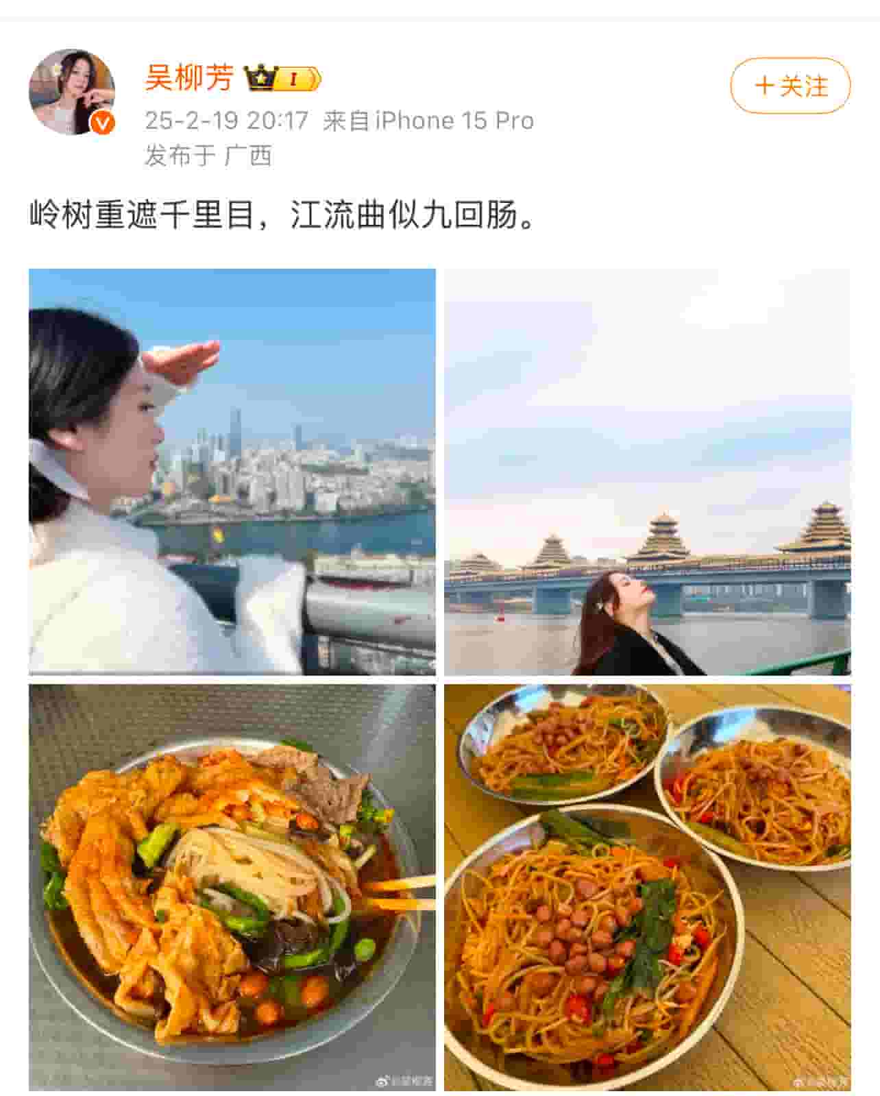 吴柳芳微博晒广西美食螺蛳粉与美景,抖音账号解封后粉丝数未涨
