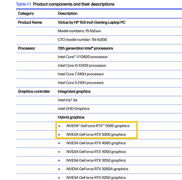 一份泄露的惠普Victus 15笔记本配置清单揭示了更多细节。在这份清单中,竟然出现了RTX 5060和RTX 5050的名字,它们与新系列的其他成员一同被列出。清单还展示了多款前代显卡,包括RTX 4060、RTX 4050、RTX 3050、RTX 3050A以及RTX 2050,显示了显卡市场的多元化选择。