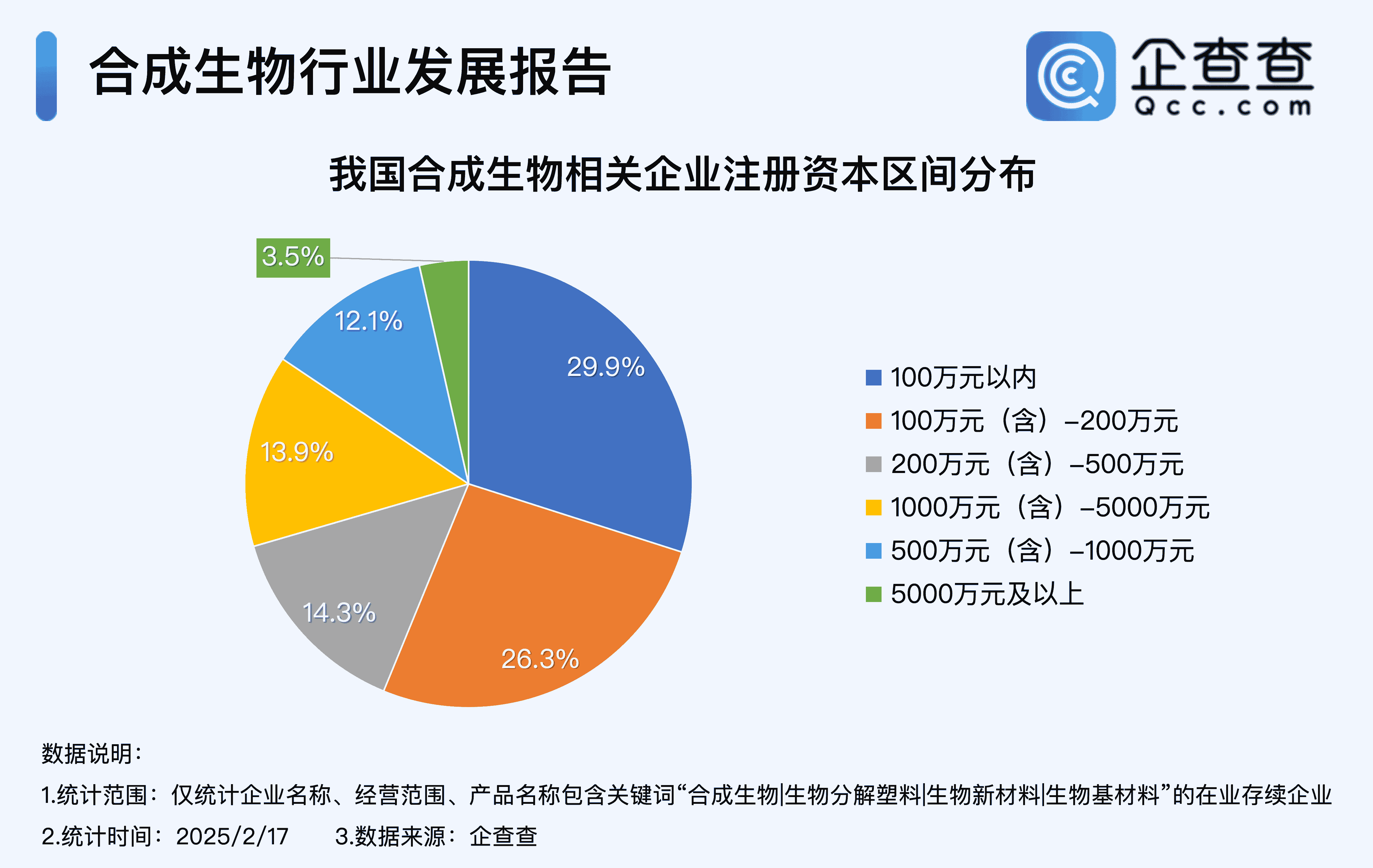企查查数据显示,公示注册资本的合成生物现存企业,多归属注册资本200万元以内,占比达56%。其中注册资本在100万元以内的企业最多,占比29.9%,注册资本在100万元-200万元的企业,占比26.3%,注册资本在5000万元及以上的企业最少,占比3.5%。