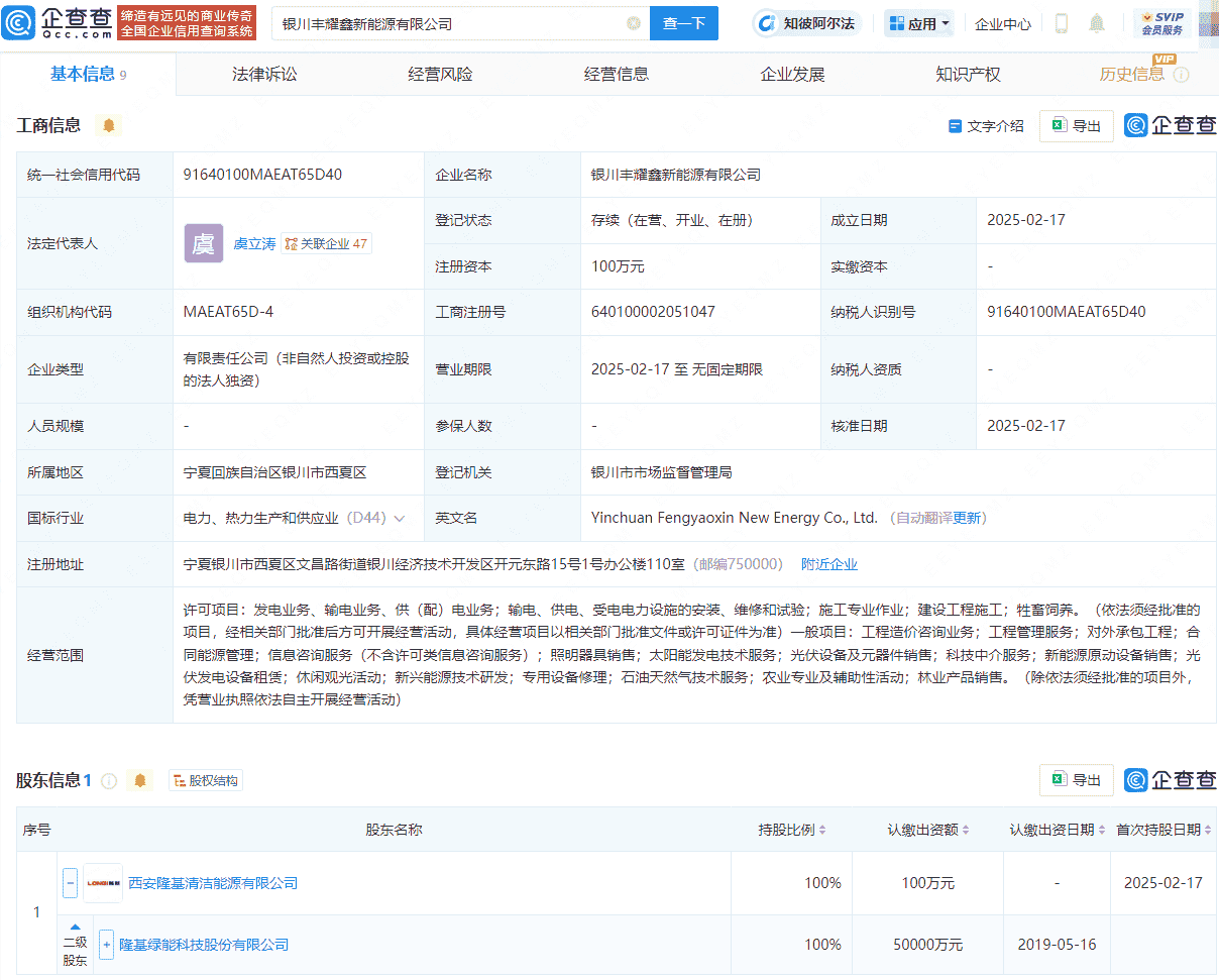 进一步深入企查查的股权穿透信息,可以发现银川泰昌源新能源有限公司和银川丰耀鑫新能源有限公司的背后,均有着隆基绿能(股票代码:601012)的间接全资控股身影。这一发现揭示了隆基绿能在新能源领域持续扩大版图,通过投资设立新公司来进一步巩固和拓展其市场地位。