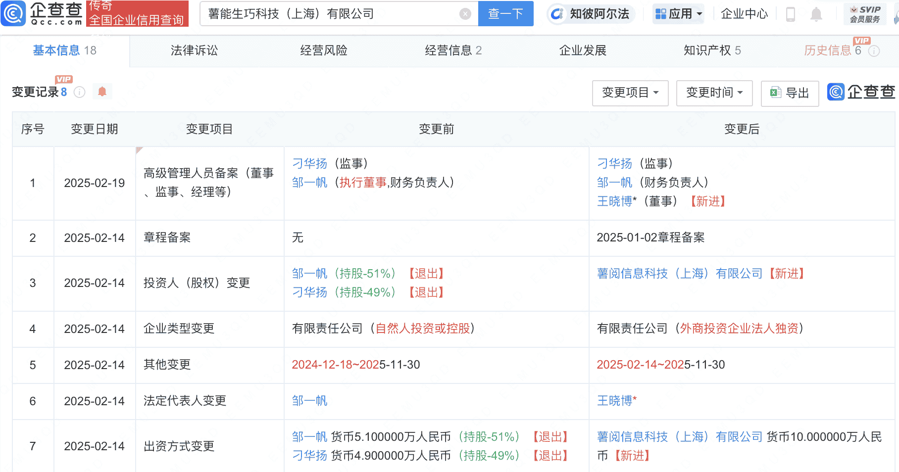 企查查APP显示,近日,薯能生巧科技(上海)有限公司发生工商变更,原股东均退出,新增小红书关联公司薯阅信息科技(上海)有限公司为全资股东。企查查信息显示,该公司成立于2024年,法定代表人为王晓博,经营范围包含:计算机软硬件及辅助设备批发;日用百货销售;日用品销售;日用品批发等。