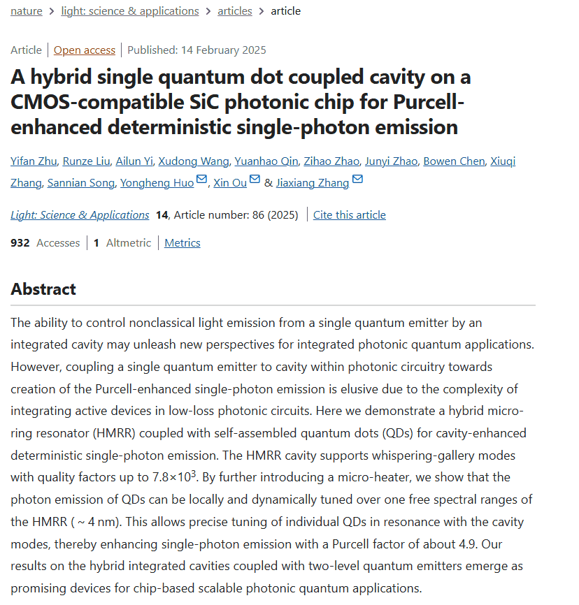为了进一步优化这一集成方案,研究人员在芯片上集成了微型加热器。通过加热,他们成功实现了对量子点激子态光谱范围的宽幅调谐,调谐范围达到了4nm。这一片上热光调谐技术,使得腔模与量子点光信号能够精准匹配,从而实现了微腔增强的确定性单光子发射。这一成果不仅展示了技术的先进性,更为光量子网络的实用化奠定了坚实基础。