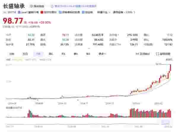 近日,机器人行业的明星股——长盛轴承,其股价再创历史新高,引发市场广泛关注。在今日的股市交易中,长盛轴承的股价强势涨停,涨幅高达20%,最新股价定格在98.77元,公司总市值也随之攀升至295亿元的新高度。