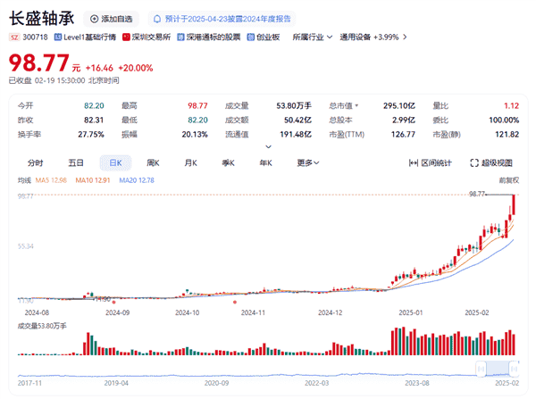近期,长盛轴承在资本市场上大放异彩,其股价不断攀升,于今日再度刷新历史高点。截至收盘,该股强势涨停,涨幅锁定在20%,股价跃升至98.77元,公司总市值随之膨胀至295亿元。