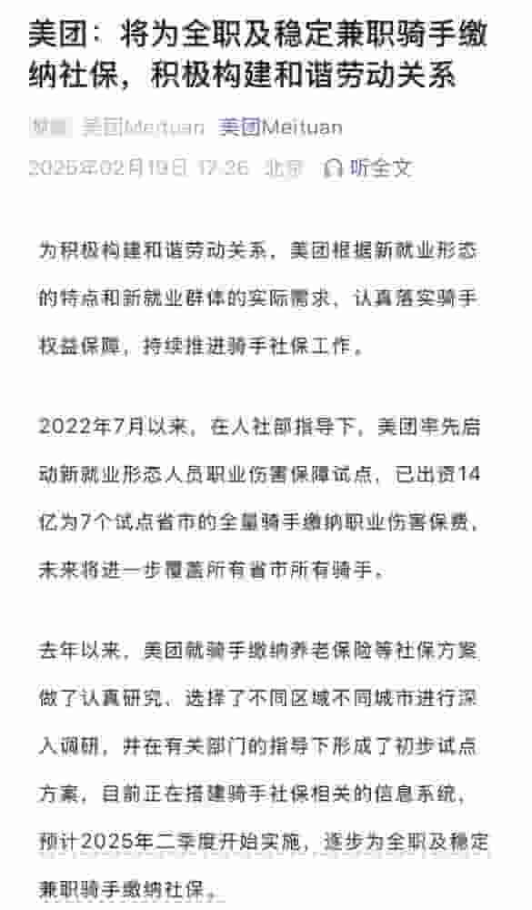 美团进一步透露,自去年以来,公司已对骑手养老保险等社保方案进行了深入研究,并在不同区域和城市进行了广泛的调研。在相关部门的指导下,美团已初步制定了试点方案,并正在紧锣密鼓地搭建与骑手社保相关的信息系统。预计从2025年二季度起,美团将逐步为全职及稳定兼职骑手缴纳社保。
