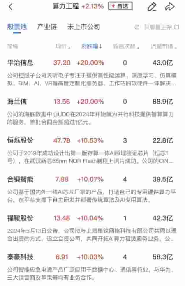 DeepSeek和算力等相关方向也迎来了修复行情。平治信息20CM涨停,竞业达、航锦科技涨停,弘信电子、首都在线、润建股份、迈信林、初灵信息等个股也表现强劲。平治信息在投资者关系活动记录表中透露,公司客户已逐步向金山云、阿里云等云服务商拓展,累计算力业务相关订单金额已超过10亿元。这一消息刺激了数据中心、服务器等算力基础设施的需求。