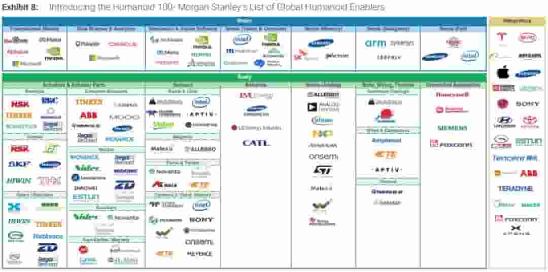 摩根士丹利近期发布的《人形机器人 100:绘制人形机器人价值链图谱》报告,则详细描绘了全球人形机器人产业链的现状。该报告公布了全球人形机器人产业链百强榜,其中中国企业占据了36席,显示出中国在人形机器人领域的强大实力和竞争力。全球56%的人形机器人相关企业总部位于中国,进一步印证了中国在这一领域的领先地位。