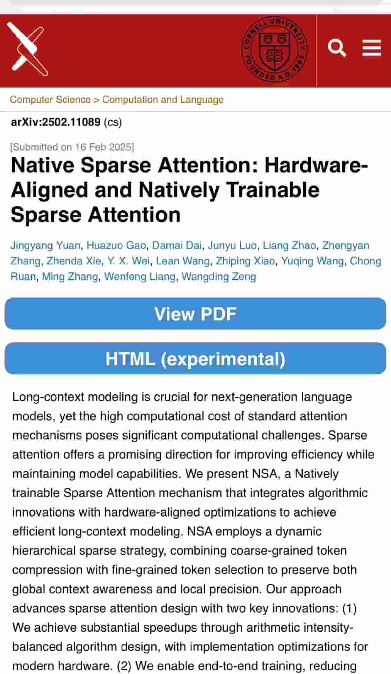 论文题为《原生稀疏注意力:硬件对齐和原生可训练的稀疏注意力》,其核心内容直指当前大语言模型面临的计算成本挑战,特别是长上下文建模的高昂代价。面对这一难题,论文提出了一种创新的解决方案——NSA(Native Sparse Attention),即原生可训练的稀疏注意力机制。