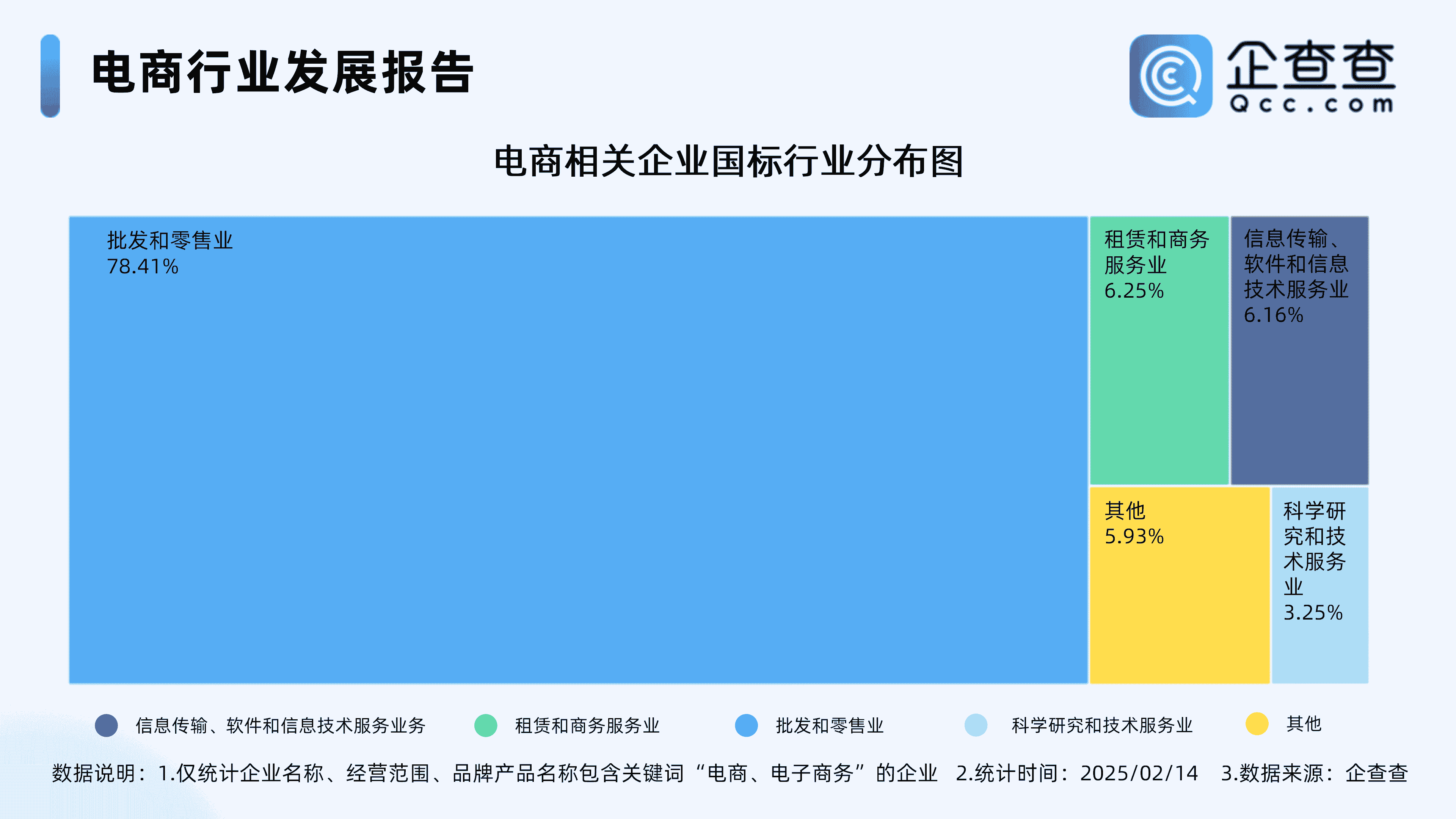 在行业分布方面,数据显示,近八成的电商相关企业归属于批发和零售业,占比高达78.41%。租赁和商务服务业、信息传输、软件和信息技术服务业以及科学研究和技术服务业也是电商相关企业的重要分布领域,分别占比6.25%、6.16%和3.25%。