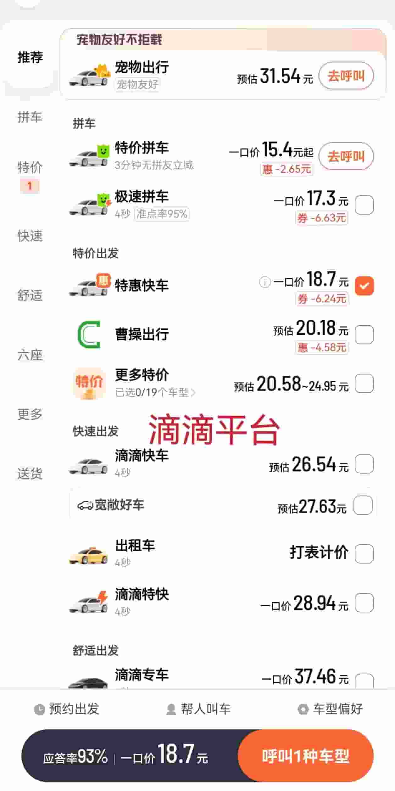 据悉,京东APP内的打车服务是由京东与易企出行合作推出的。用户点击“国内打车服务”后,会被引导至易企出行的小程序页面,在这里可以选择实时叫车、预约叫车以及接送机服务。车型方面,更是涵盖了普通、舒适、商务、豪华等多种选择,接入了曹操、飞嘀、阳光等多家网约车平台,为用户提供丰富的出行选择。