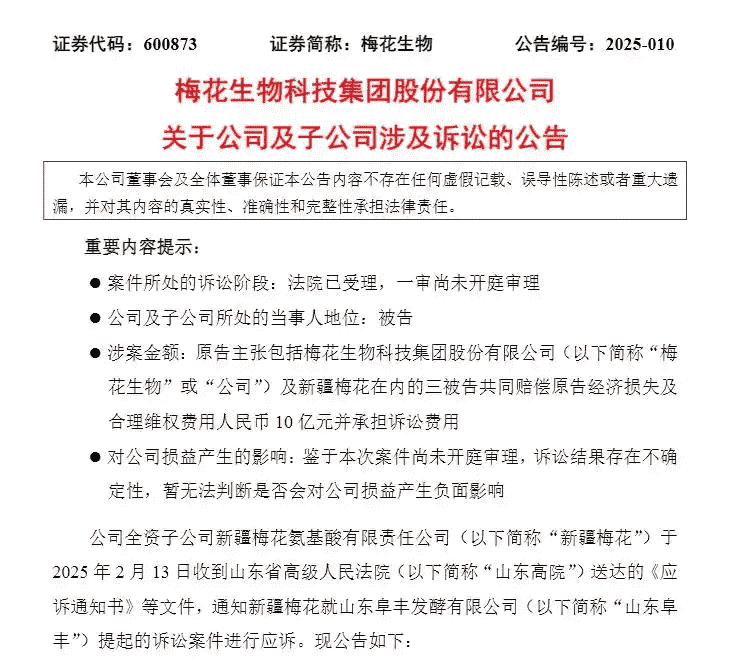 据悉,该诉讼源于2月14日梅花生物发布的公告。公告显示,山东阜丰已向法院提起诉讼,指控梅花生物及其子公司侵犯其商业秘密,并索赔人民币10亿元,同时要求三被告承担诉讼费用。目前,该案件已被法院受理,但一审尚未开庭。