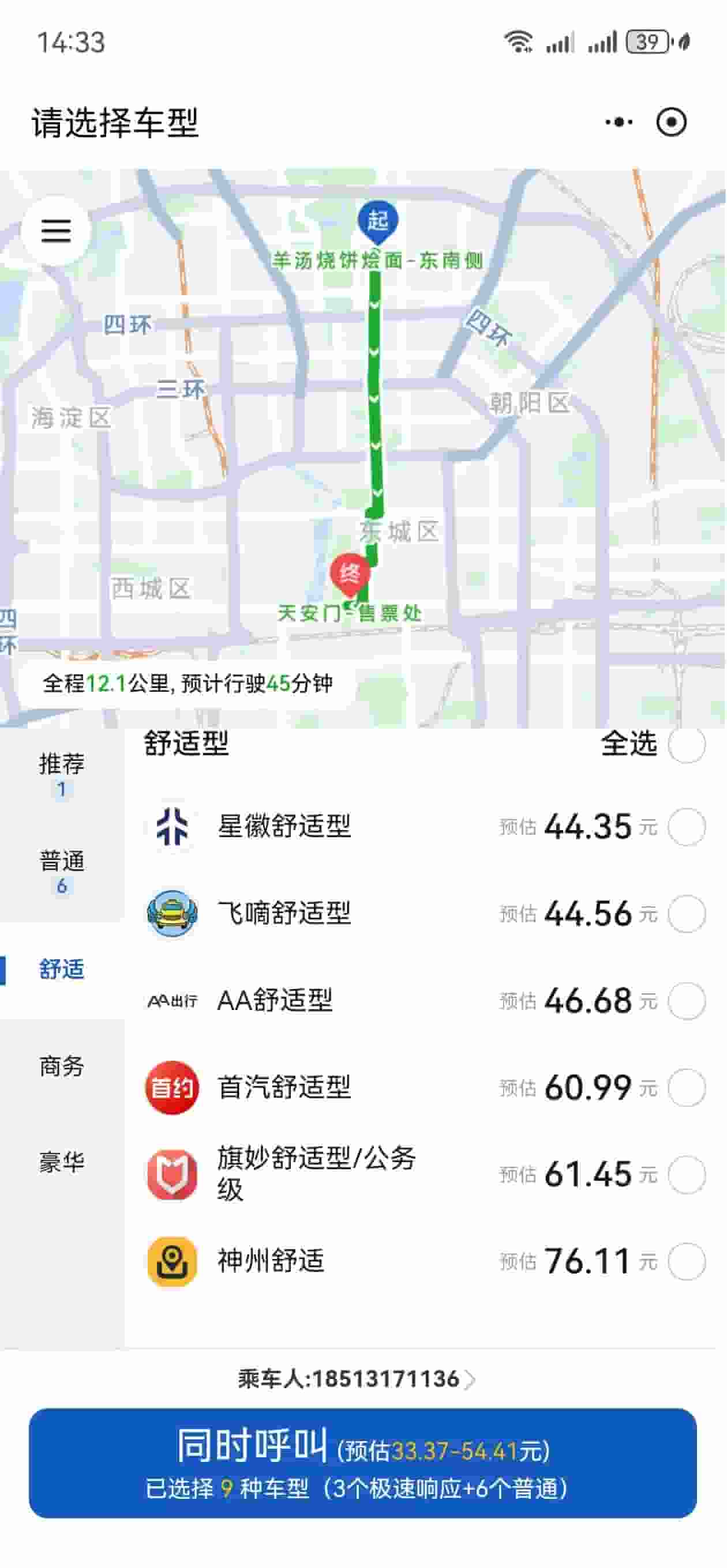 点击进入后,用户会被引导至一个名为“易企出行”的第三方平台小程序。这个平台为用户提供了多种出行选择,包括普通、舒适、商务和豪华四种车型,每种车型下又有神州、首汽等多个知名品牌供用户挑选,充分展现了服务的多样性和专业性。