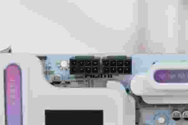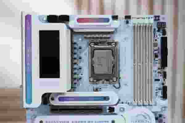 iCraft B860M CROSS系列主板在外观设计上延续了上一代产品的经典元素,但又有所创新。纯白色的PCB板、内存插槽以及散热装甲,搭配上粉蓝色的涂装和RGB灯板,营造出一种清新脱俗且充满活力的视觉效果。特别是左侧的CPU供电装甲,采用了全新的设计造型,屏幕位置上移,与装甲的圆角切面完美融合,整体呈现出和谐而对称的美学风格。