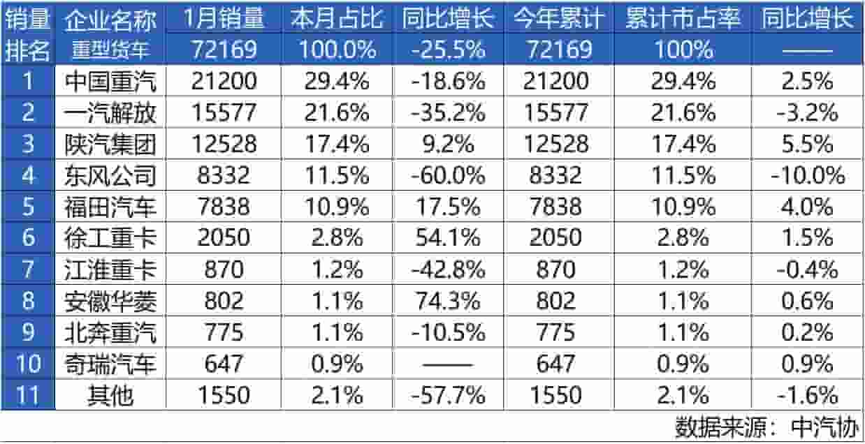 中国重汽1月重卡销量下滑却领跑市场,市占率同比增长2.5%