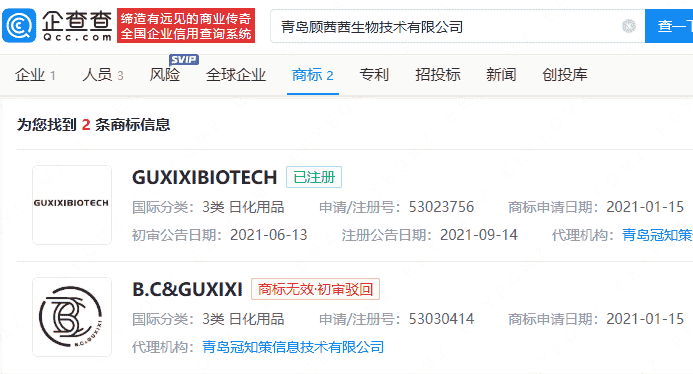 企查查APP显示,顾茜茜名下共关联8家企业,其中7家为存续或开业状态,包括青岛顾茜茜生物技术有限公司、杭州顾顺文化传播有限公司等,并担任执行董事、经理等职务。企查查显示,顾茜茜全资持股的青岛顾茜茜生物技术有限公司已成功注册“GUXIXIBIOTECH”商标,国际分类为日化用品。该公司还曾申请注册“B.C&GUXIXI”商标,目前已被驳回,处于无效状态。
