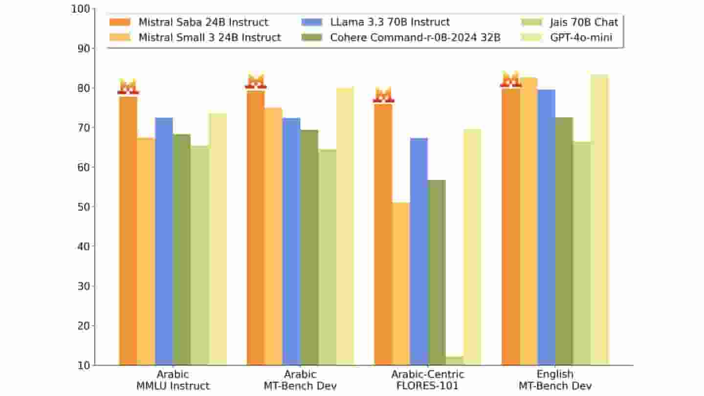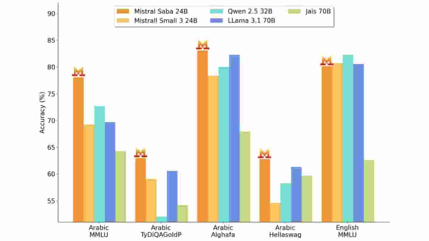 Saba模型基于精心挑选的中东与南亚数据集进行训练,尽管其参数规模仅为32B,却能在本地单GPU系统上高效部署。据Mistral AI提供的数据,Saba在阿拉伯语模型基准测试中表现突出,不仅超越了同参数规模的Mistral Small 3 24B,即便与更大参数规模的模型相比也毫不逊色。
