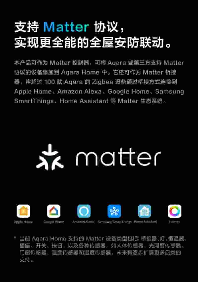 作为Aqara首款支持户外使用的网关设备,G5 Pro集成了Zigbee 3.0与Thread双协议,并兼容Matter标准。这意味着用户可以通过Apple Home、Aqara Home等平台,将摄像机与智能门锁、灯光、传感器等设备无缝联动,构建起一个昼夜安全无忧的智能家居安防体系。