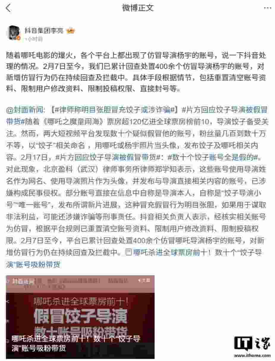 近期,抖音集团针对仿冒知名导演杨宇(艺名饺子)账号的行为展开了严厉打击。抖音副总裁李亮公开发声,详细阐述了平台所采取的一系列措施。