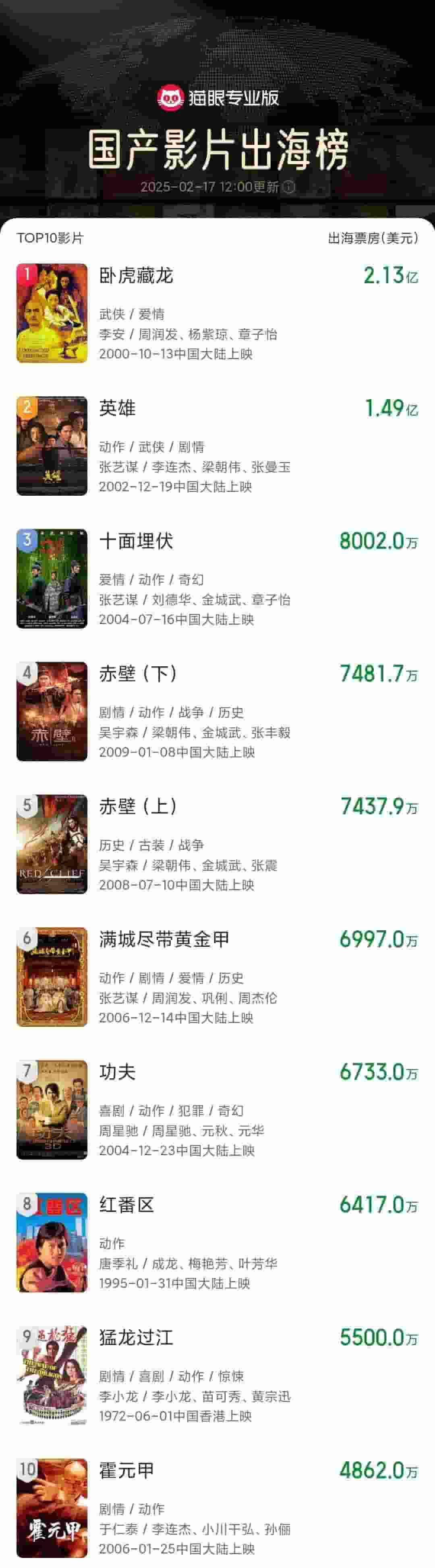 而在国产影片出海榜上,《哪吒之魔童闹海》同样表现出色,目前位列第18名,出海总票房达到1059.9万美元(折合人民币约7697.5万元)。这一成绩不仅证明了影片在海外的广泛影响力,也为更多国产影片走向世界提供了宝贵的经验和启示。
