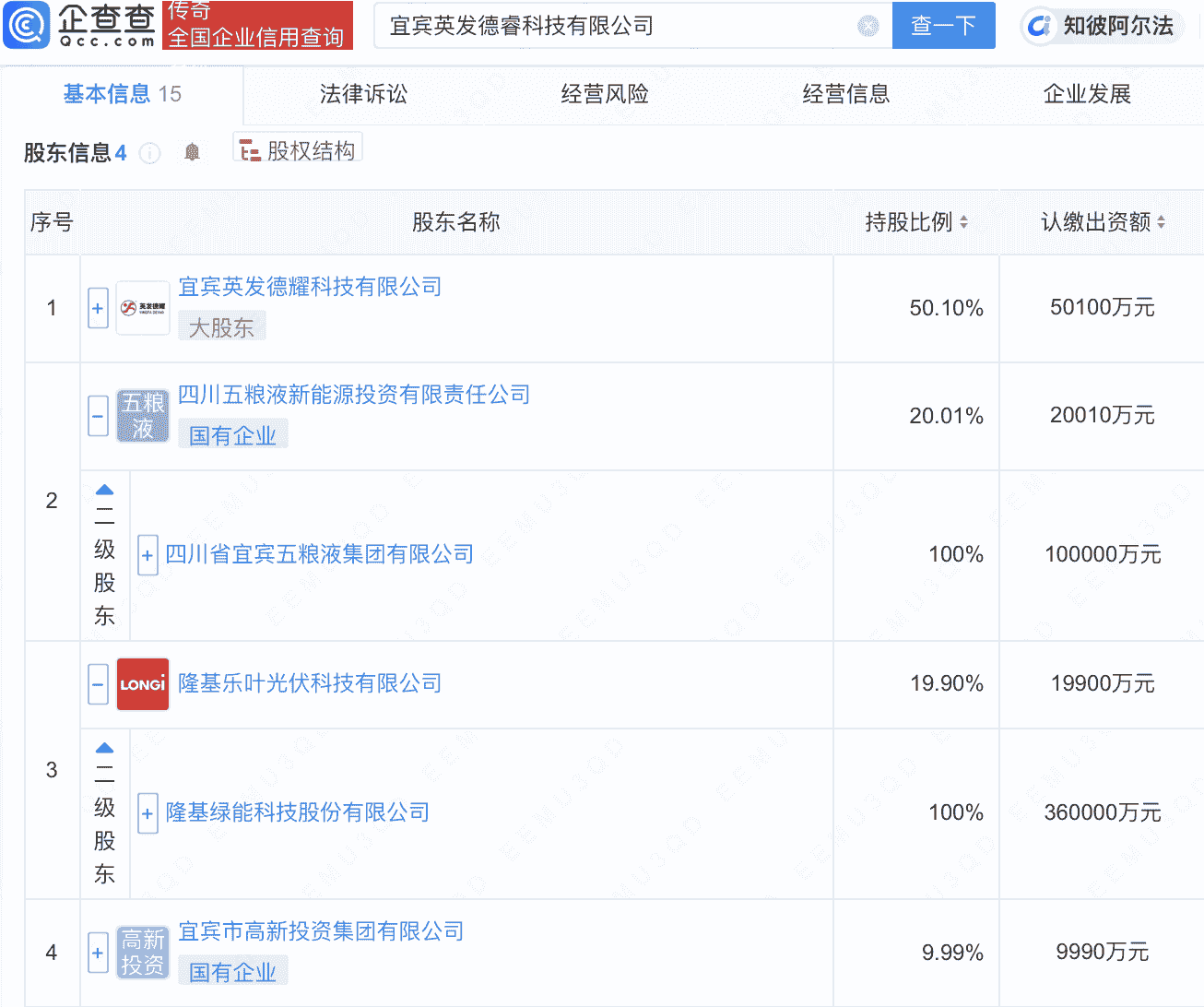 通过企查查的股权穿透功能,可以清晰地看到宜宾英发德睿科技有限公司的股权结构。据悉,该公司是由五粮液集团旗下的四川五粮液新能源投资有限责任公司,以及隆基绿能(股票代码:601012)旗下的隆基乐叶光伏科技有限公司等共同出资设立的。