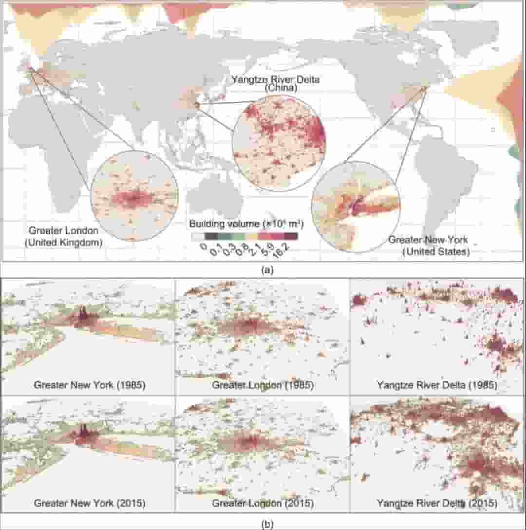 研究还揭示了一些有趣的现象。例如,2015年全球建筑总体积超过了1万亿立方米。而在1985年至2015年间,虽然三维建筑体积的增长幅度略有增加,但二维建筑占地面积和城市范围的扩张幅度却显著减少。这表明城市土地的垂直维度利用强度正在不断增强。