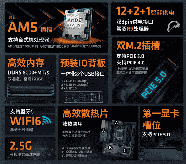 NITRO+氮动B850M WIFI主板采用了ATX标准版型,配备了豪华的12+2+1相供电电路和双8针供电接口,选用了高品质的NITRO+电容,并覆盖了大面积的散热片,确保处理器在高负载下的稳定运行。该主板支持AMD锐龙7000/8000G/9000系列处理器,为高性能计算提供了坚实的基础。