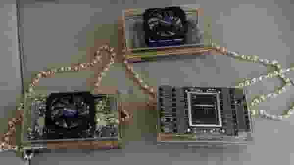 然而,GPU Purse并未止步于此。他们似乎对入门级显卡并不满足,于是推出了另一款更加高端的作品——使用AI领域炙手可热的高端GPU H100制成的背包。这款背包的曝光图片较为神秘,只展示了一侧,且是与其它产品的合影。从图片中可以隐约看出,这款背包使用的是H100加速卡的核心部分,去除了边缘,仅保留了中央庞大的GPU芯片及其周围的电感。