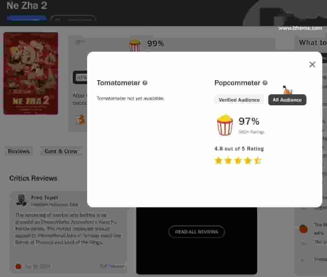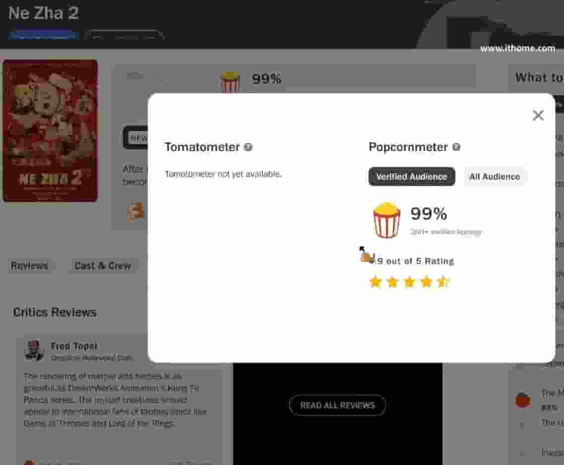 《哪吒之魔童闹海》海外热映,烂番茄爆米花指数高达99%获赞无数