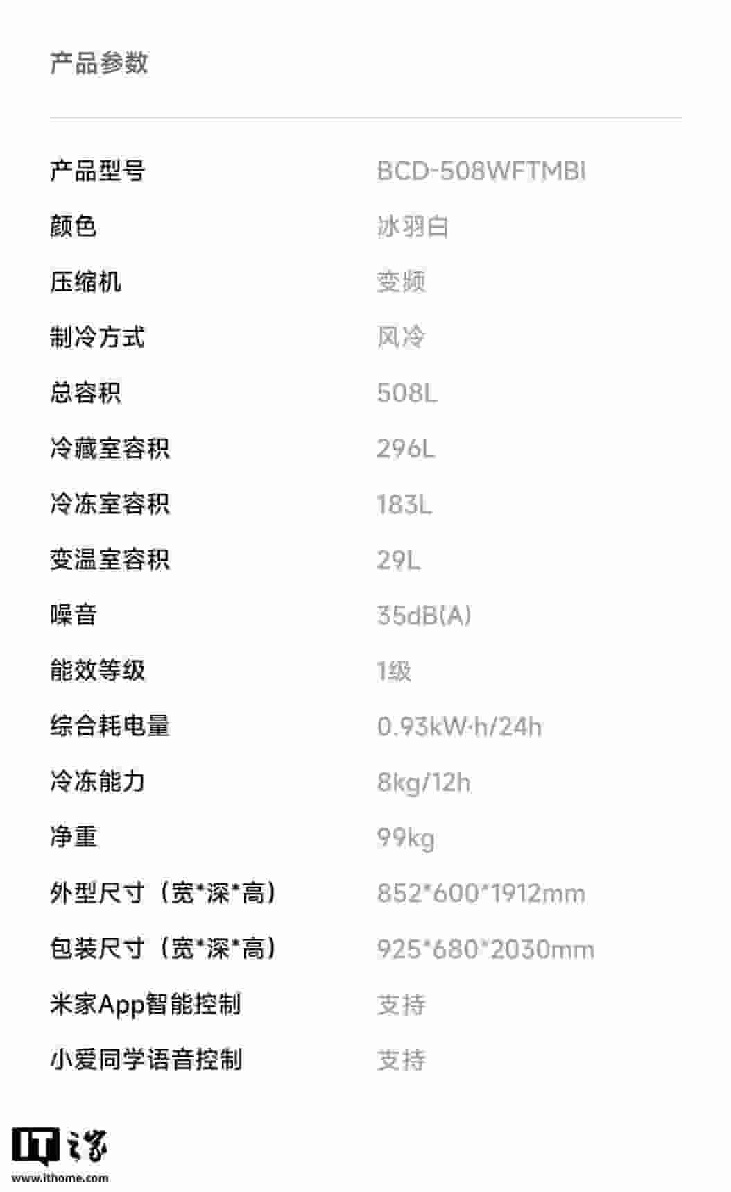 技术规格上,米家冰箱 Pro 双系统法式平嵌 508L 冰羽白采用了双系统制冷技术,有效避免了食物间的串味问题。冰箱的噪音控制得相当出色,仅为35分贝,为用户提供了宁静的使用环境。在能耗方面,该冰箱24小时的综合耗电量约为0.93度,表现出色。