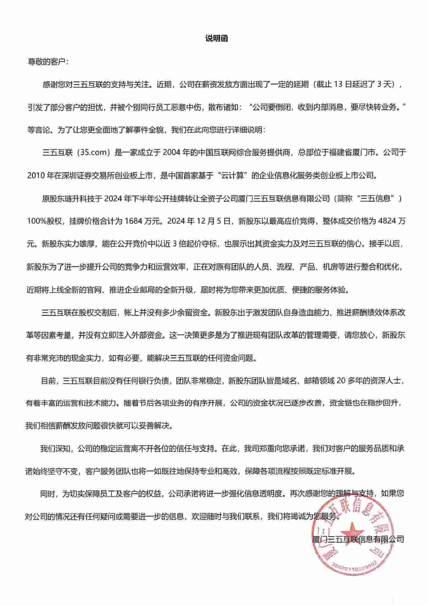 公告的发布,无疑是对之前网络上流传的一则《工资延期发放通知》的正式回应。该通知落款为“厦门三五互联信息有限公司”,声称公司因经营困境和资金流转问题,无法按时支付员工工资。通知中提到,受行业竞争加剧和建站市场衰落的影响,公司业务受到严重打击,资金回笼缓慢。截至通知发布时,公司银行账户余额仅为133032.64元,远低于需支付的2025年1月份员工工资总额,以往月平均工资总额约为120万元,同时还有各种供应商费用等待支付。