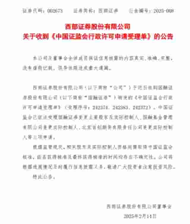 近日,西部证券对国融证券的现金收购案取得了重要进展。西部证券官方宣布,公司已接收到国融证券转交的《中国证监会行政许可申请受理单》,标志着证监会已正式受理此次股权变更的申请。