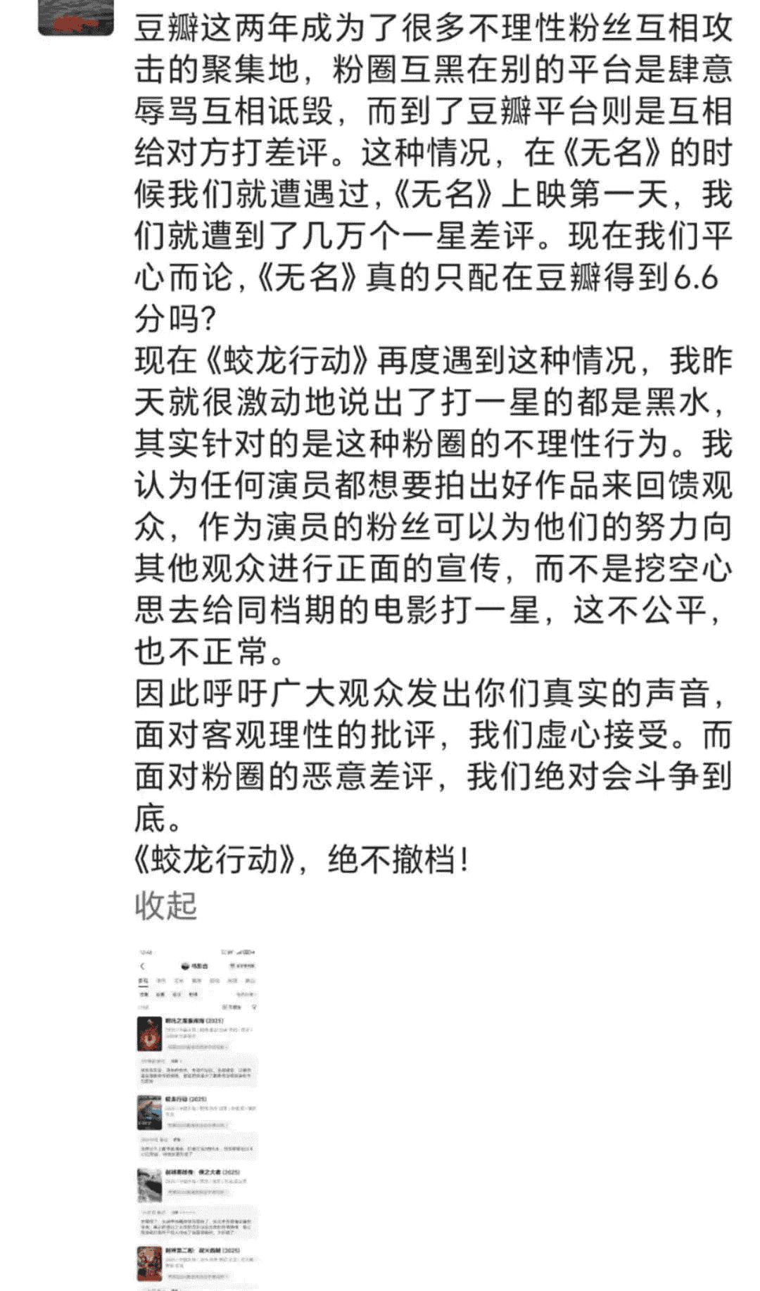然而,面对豆瓣平台上影片遭遇的差评风波,于冬在随后的发言中显得更为冷静。他承认豆瓣已成为粉丝互黑的战场,指出《无名》也曾遭遇类似情况,但他呼吁观众应给予《蛟龙行动》真实评价,并表示影片团队会虚心接受理性批评,但坚决反对恶意差评。
