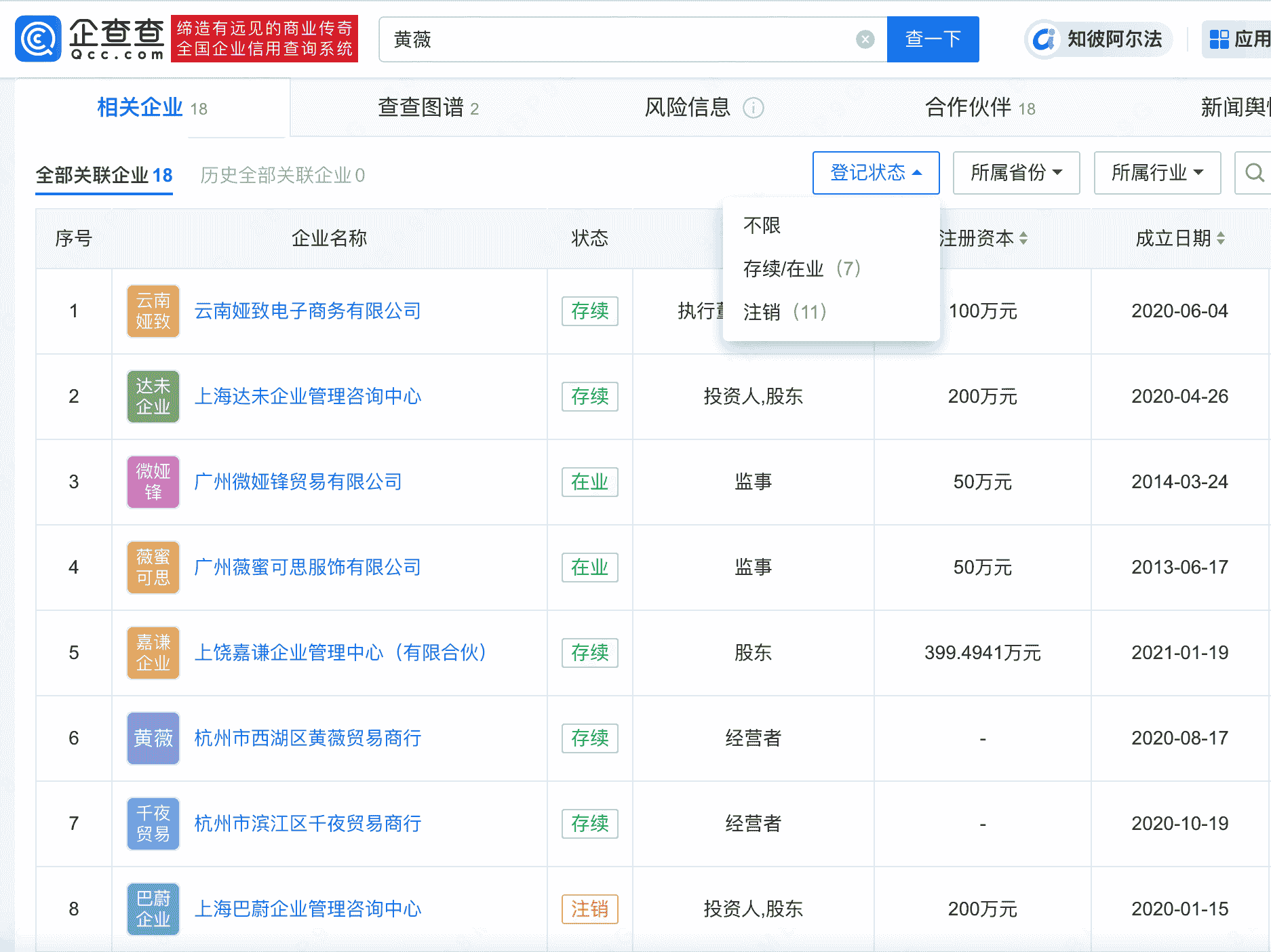 近期,企查查APP上的信息显示,知名主播薇娅(本名黄薇)所投资的多家企业发生了经营状态变更。其中,上海简哲企业管理咨询中心和上海卢蔚企业管理咨询中心等多家企业的状态由“存续”转变为“注销”。这些企业的注册资本均为200万元人民币,业务范围均归类于租赁和商务服务业。