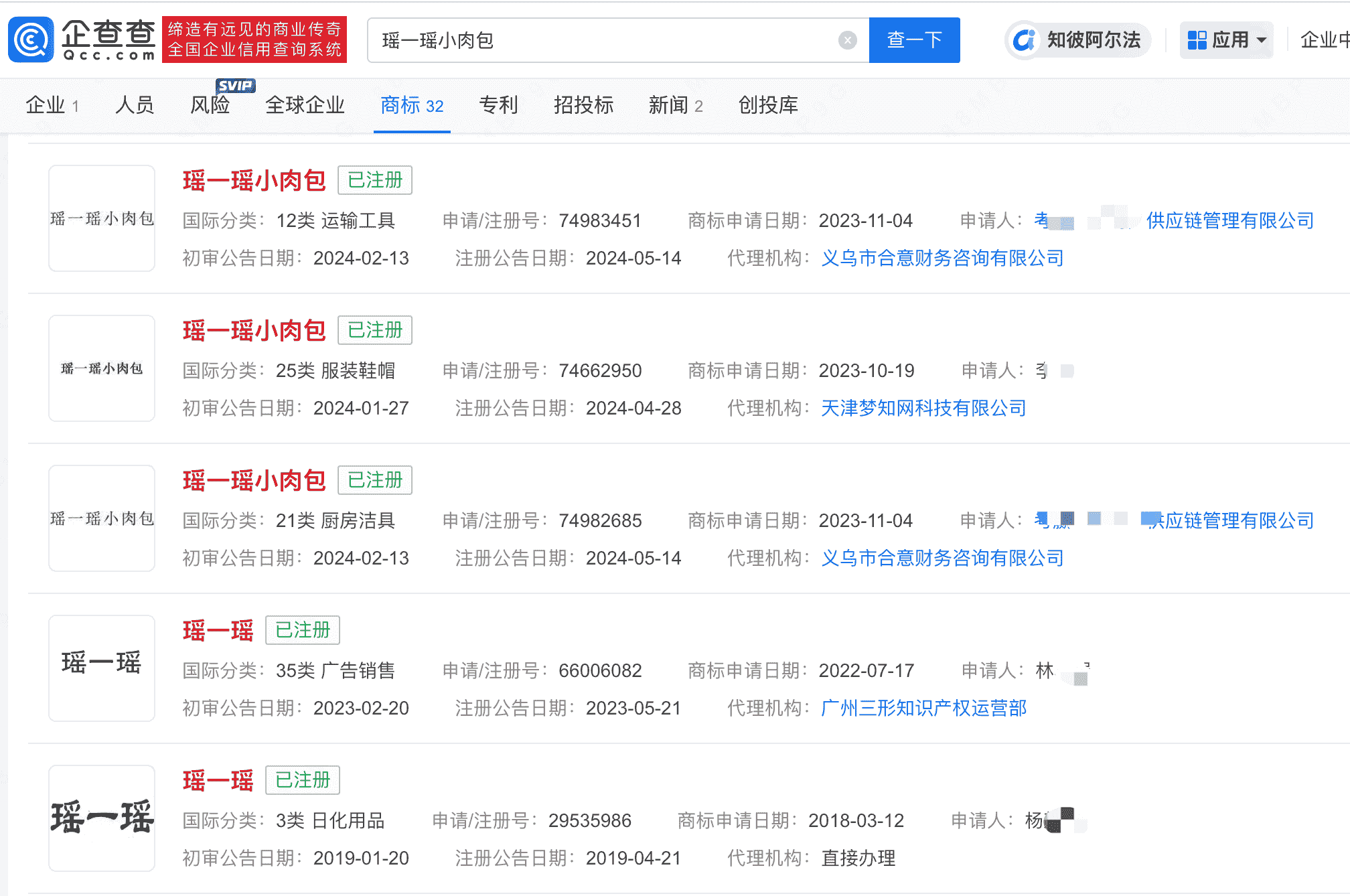 查询企查查APP发现,“瑶一瑶”“瑶一瑶小肉包”已被多方抢注成商标,申请人包括多名自然人和供应链管理公司。