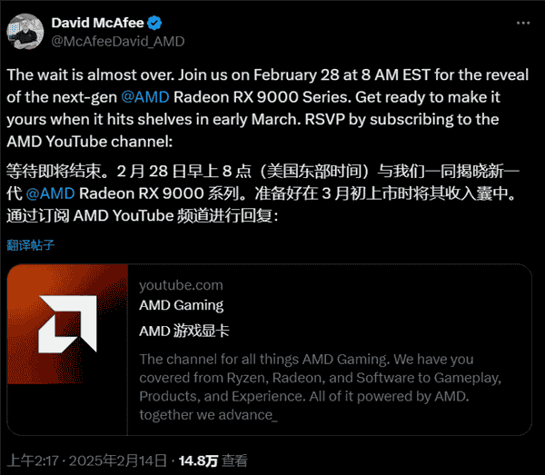 NVIDIA的动作迅速引起了AMD的回应。AMD企业副总裁David McAfee宣布,RX 9070系列显卡将于2月28日21点正式揭晓,届时将公布详细的规格参数、性能表现及价格信息。虽然具体的上市时间被定在3月初,但AMD显然已经做好了充分的准备,欲在中端市场与NVIDIA一较高下。