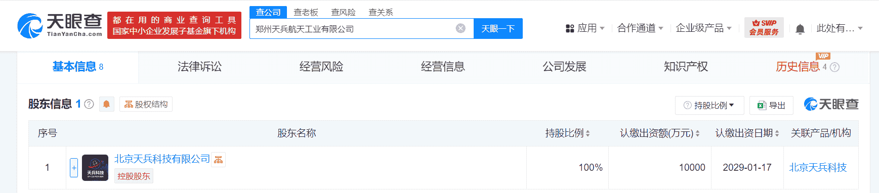 根据天眼查提供的信息,郑州天兵航天工业有限公司的股权结构清晰,为北京天兵科技有限公司全资所有,这显示出天兵科技在航天领域的进一步布局和深化。