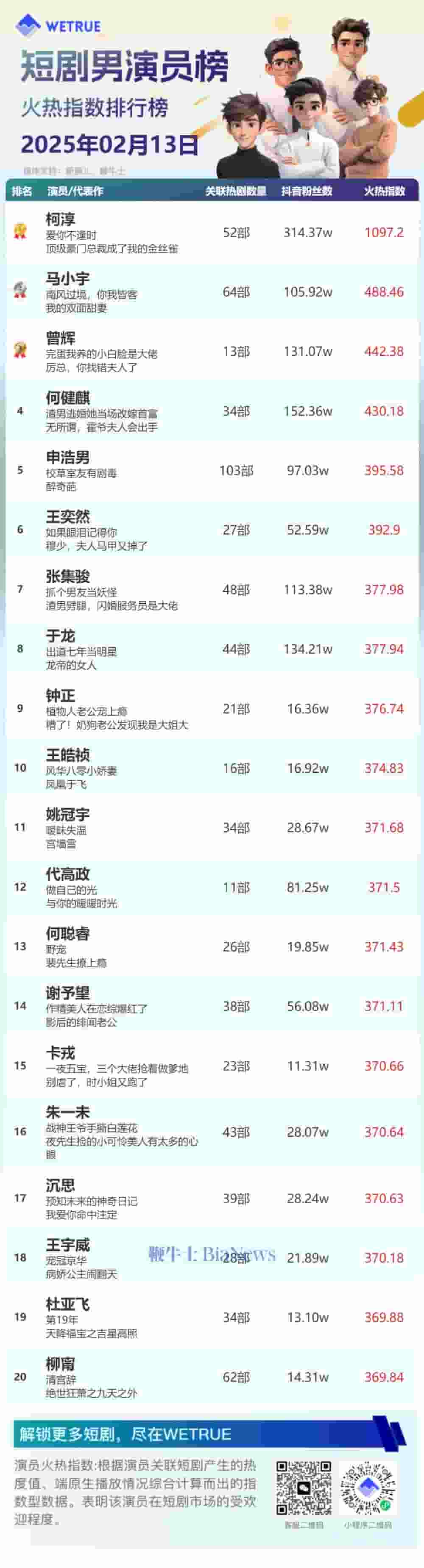 2月13日短剧演员火热榜揭晓:余茵、柯淳登顶,谁是你的心头好?