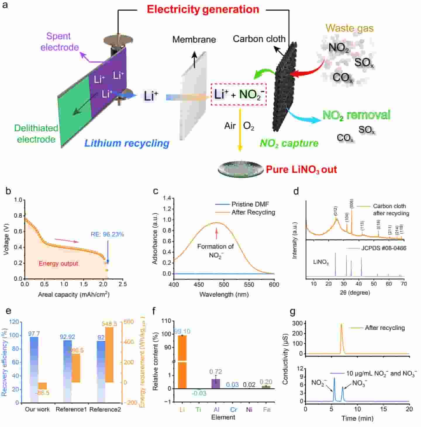 这一创新策略的核心在于设计了一种无需外部能量输入的回收工艺。研究团队利用尾气中的二氧化氮(NO2)与废旧电池正极材料之间的电化学电位差,实现了锂资源的有效回收,并将有害的二氧化氮转化为高附加值的硝酸锂盐。