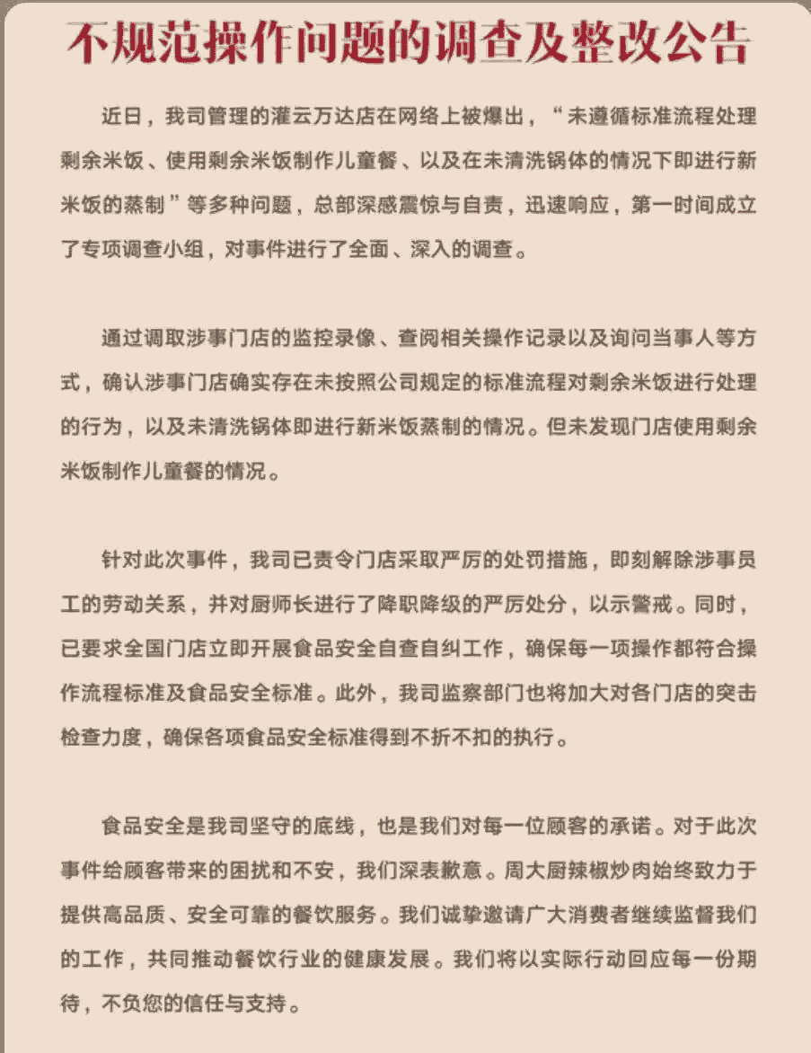面对这一连串的指控,周大厨总部迅速作出反应。2月12日,该品牌发布了一份详细的《不规范操作问题的调查及整改公告》。公告中,周大厨表达了对此次事件的震惊与自责,并宣布已立即成立专项调查小组,对事件展开全面深入的调查。