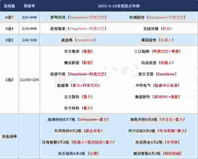 在连板股方面,连板晋级率下滑至35%。此前达到10连板的新炬网络和8连板的美格智能均未能继续晋级。4只6连板个股表现分化明显,浙数文化一度跌停,拓维信息尾盘回落,而梦网科技则在尾盘集合竞价阶段完成回封,晋级7连板。人气股光线传媒午后涨停,带动DeepSeek概念及相关高弹性人气股午后反弹,但尾盘再度出现分歧。