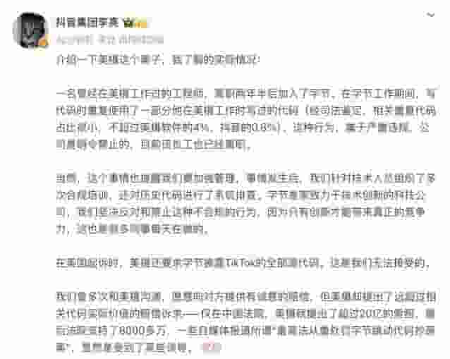 抖音集团对此事作出了正式回应,副总裁李亮指出,涉事员工曾在美摄科技任职,离职两年半后才加入字节跳动。该员工在后续的工作中,确实使用了一部分在美摄期间编写的代码。尽管这些代码在总量中占比较小,不足美摄软件总代码量的4%,也不到抖音总代码量的0.8%,但这种行为确实违反了行业规范。该员工在事件曝光后已主动离职。