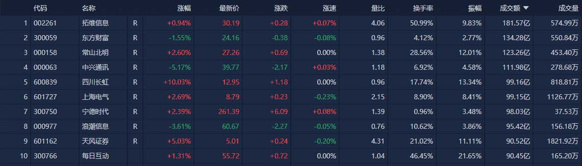 具体到个股表现,拓维信息的成交额位居首位,高达181.57亿元。紧随其后的是东方财富、常山北明、中兴通讯和四川长虹,它们的成交额分别为134.28亿元、123.26亿元、111.98亿元和99.16亿元,显示出这些股票在市场上的活跃度和投资者的关注度。