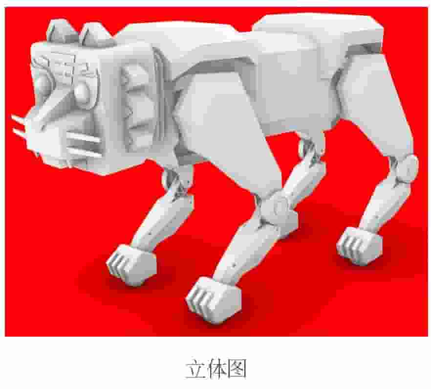 据悉,该专利产品的核心设计亮点在于其独特的形状,它不仅仅是一个机械类机器人,更是一款融合了创意与艺术感的作品。从专利图中可以看到,这款机器人采用了老虎作为设计原型,不仅四足行走的形态栩栩如生,其面部还巧妙地融入了老虎标志性的“王”字图案,使得整体造型既威猛又富有文化气息。