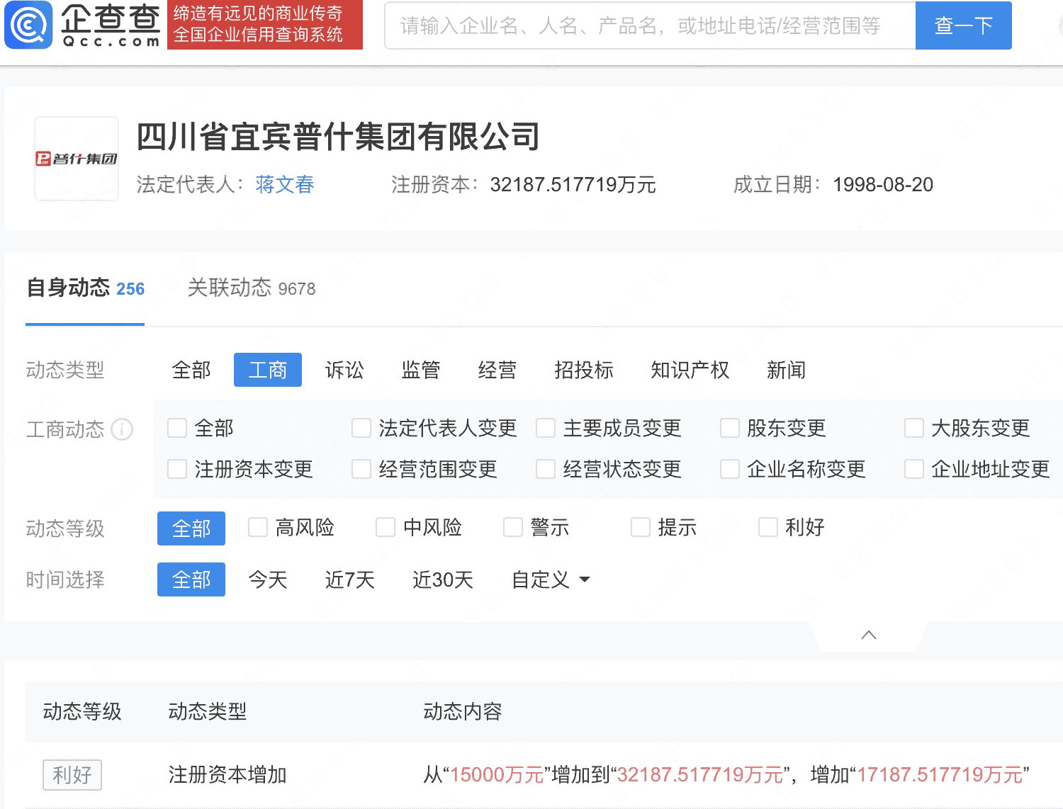 企查查APP显示,近日,四川省宜宾普什集团有限公司发生工商变更,注册资本由1.5亿人民币增至约3.2亿人民币。企查查信息显示,该公司成立于1998年,法定代表人为蒋文春,经营范围包括企业管理服务、商品批发与零售、进出口业务等,由四川省宜宾五粮液集团有限公司全资持股。