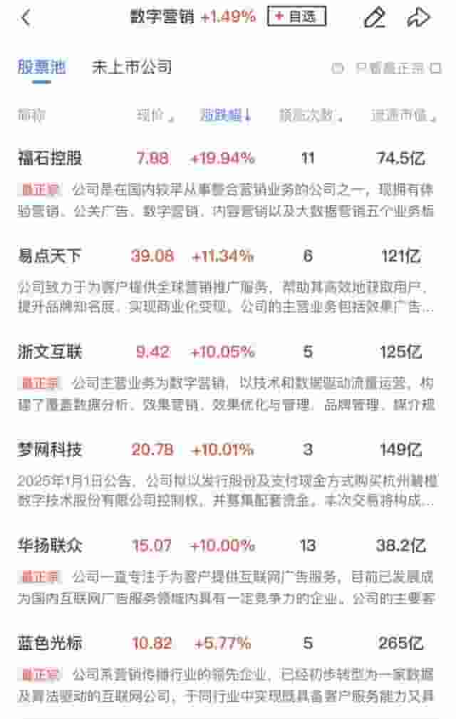 AI应用方向也持续活跃,其中AI营销概念表现突出。福石控股、华扬联众等个股涨停,易点天下等多只个股涨幅居前。这一波上涨行情受到美股科技股财报的提振,移动应用广告平台AppLovin的财报超出预期,股价大涨30%。