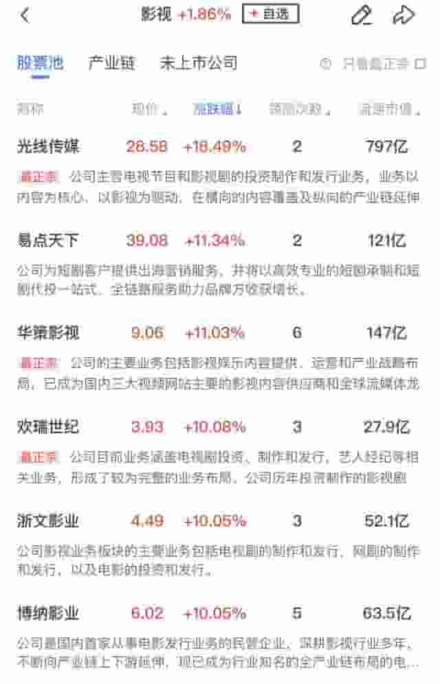 影视股同样迎来大涨,光线传媒股价再度飙升超过18%,创历史新高。博纳影业、欢瑞世纪等多只个股涨停。这一波上涨行情受到影视作品的推动,据报道,《哪吒之魔童闹海》总票房已超越《死侍与金刚狼》,进入全球影史票房榜前20名,成为首部进入该榜单前20的亚洲电影。
